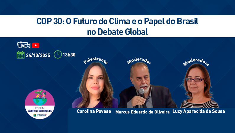 A 30ª Conferência das Nações Unidas sobre Mudança do Clima (COP 30) será realizada em Belém, entre os dias 10 e 21 de novembro deste ano. Para discutir as perspectivas e o papel do Brasil nas discussões climáticas internacionais, o Fórum de Economia e Meio Ambiente do Corecon-SP promove, nesta sexta-feira, 24 de outubro, às 13h30, uma live especial sobre o tema.