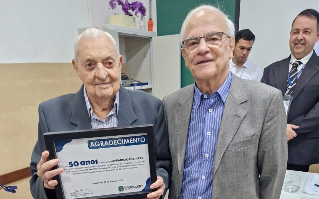 “O senhor Apparicio nos inspira com sua trajetória, com sua presença e com o legado que construiu ao longo de tantos anos. Por isso, neste momento especial, o Corecon-SP entrega uma de placa de Reconhecimento como símbolo da nossa mais sincera admiração, profundo respeito e eterna gratidão. Muito obrigado, senhor Apparicio, por sua história e pelo exemplo que continuará inspirando gerações de economistas”, disse o presidente Odilon Guedes.