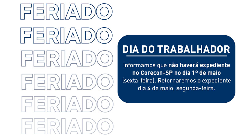 Informamos que, devido ao feriado do Dia do Trabalho, não haverá expediente no Corecon-SP no dia 1º de maio.