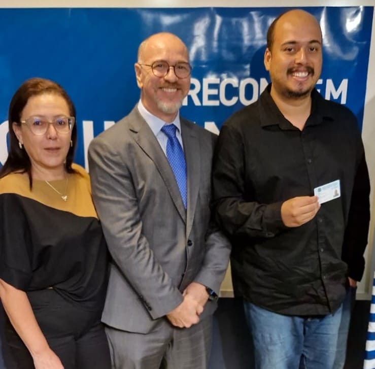 O presidente do Corecon-SP, Haroldo da Silva, acompanhado por Claudete Magalhães, do Departamento de Atendimento e Registro, realizou a entrega das carteiras aos economistas Davi do Nascimento Cidreira e Havamelly Fernandes da Silva, que optaram por retirar o documento na sede da entidade.