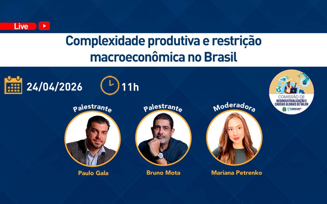A Comissão de Neoindustrialização e Cadeias Globais de Valor do Corecon-SP, em parceria com o Corecon Bahia, promove, no próximo dia 24 de abril, às 11h, uma live para discutir os desafios da complexidade produtiva e das restrições macroeconômicas no Brasil. O evento será transmitido pela TV Economista e também pelo canal do economista Bruno Mota.