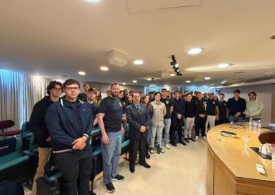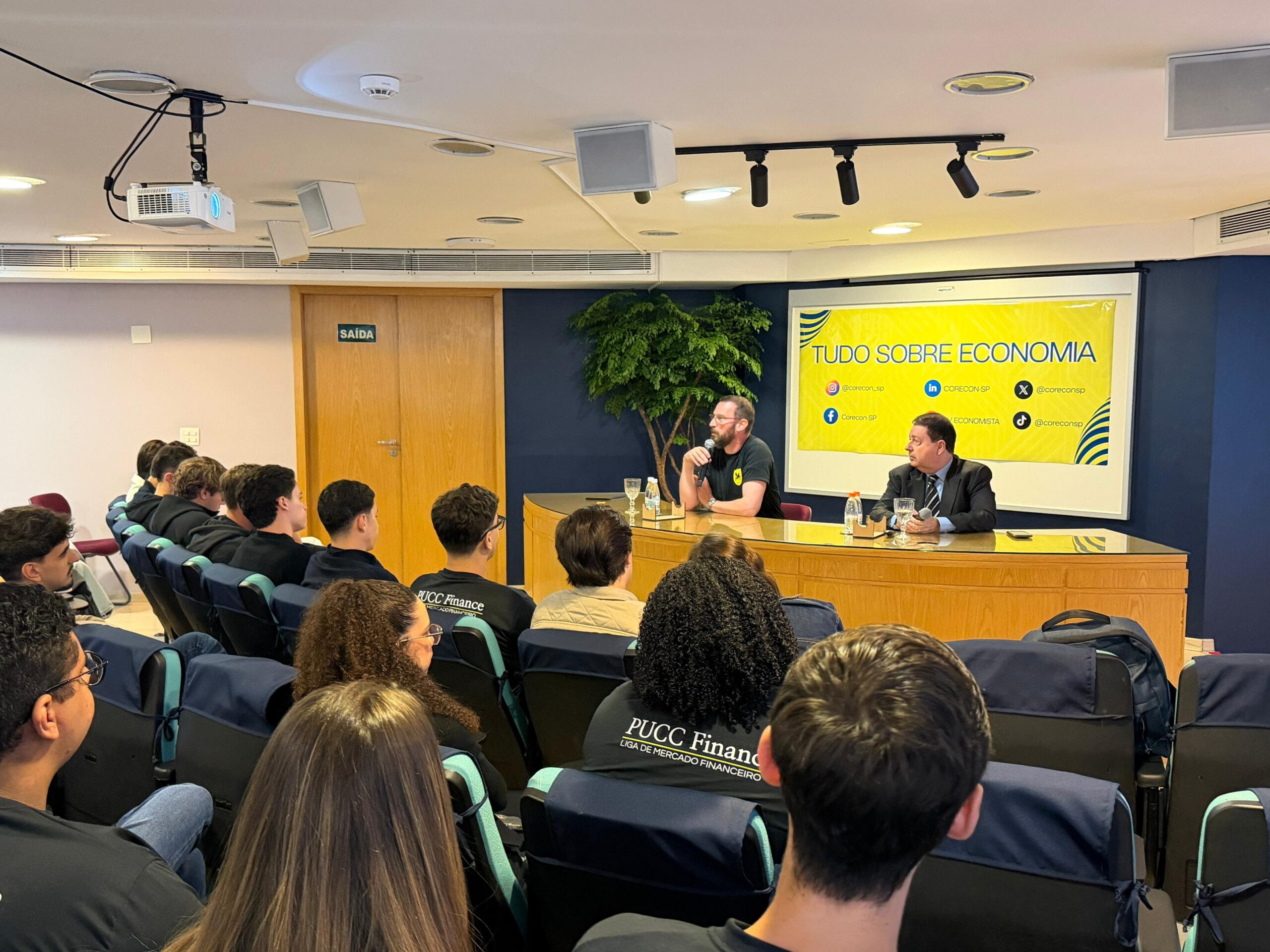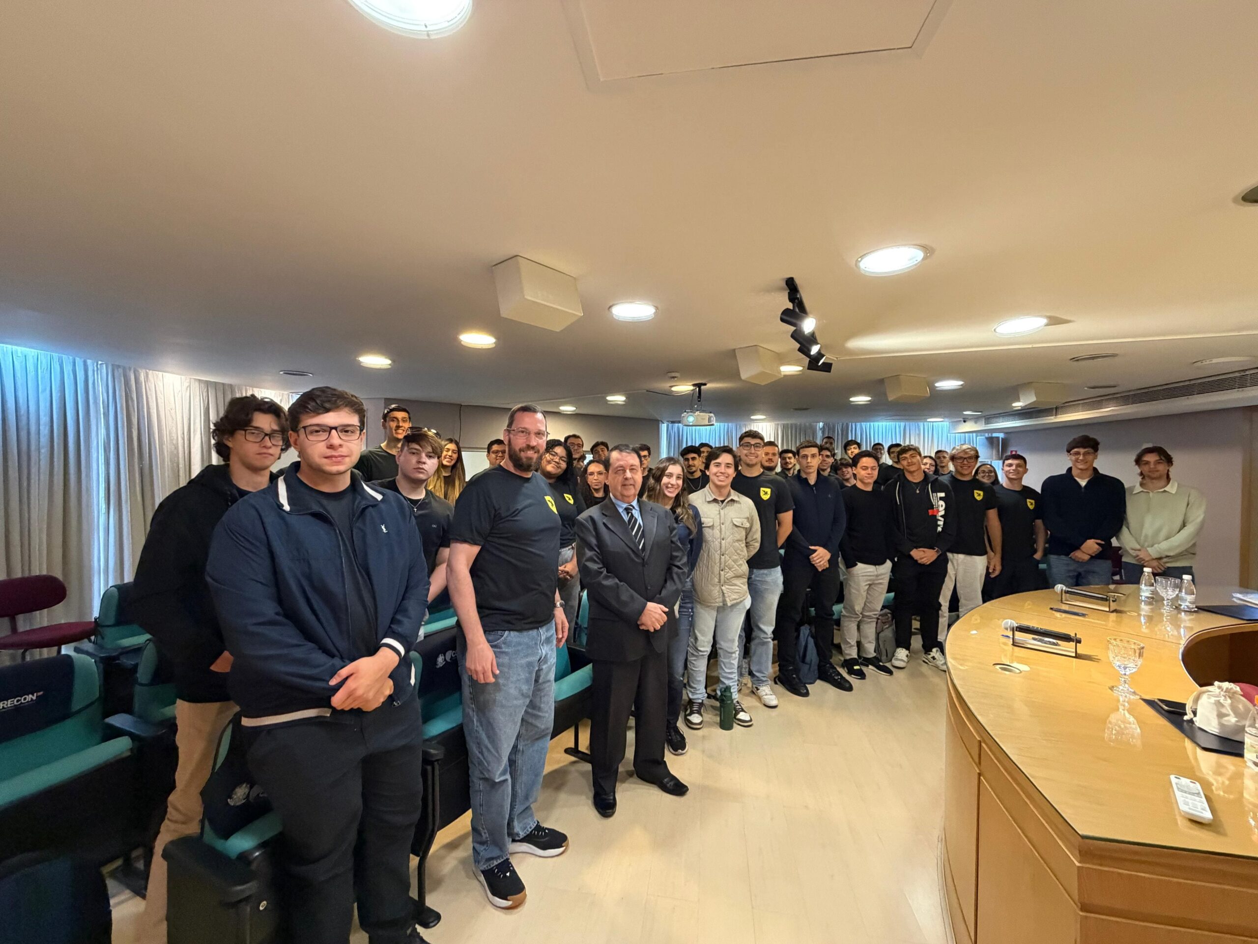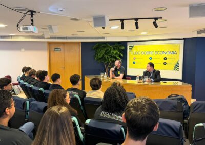 Durante a visita, os estudantes acompanharam uma palestra sobre a conjuntura econômica atual, com análises sobre o cenário nacional e internacional, além de reflexões sobre as oportunidades no mercado de trabalho e os impactos da inteligência artificial nas diferentes áreas de atuação.
