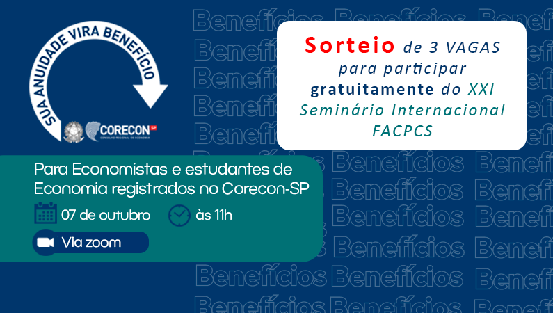 Corecon-SP sorteará 3 VAGAS para participar gratuitamente do Seminário de forma virtual.
