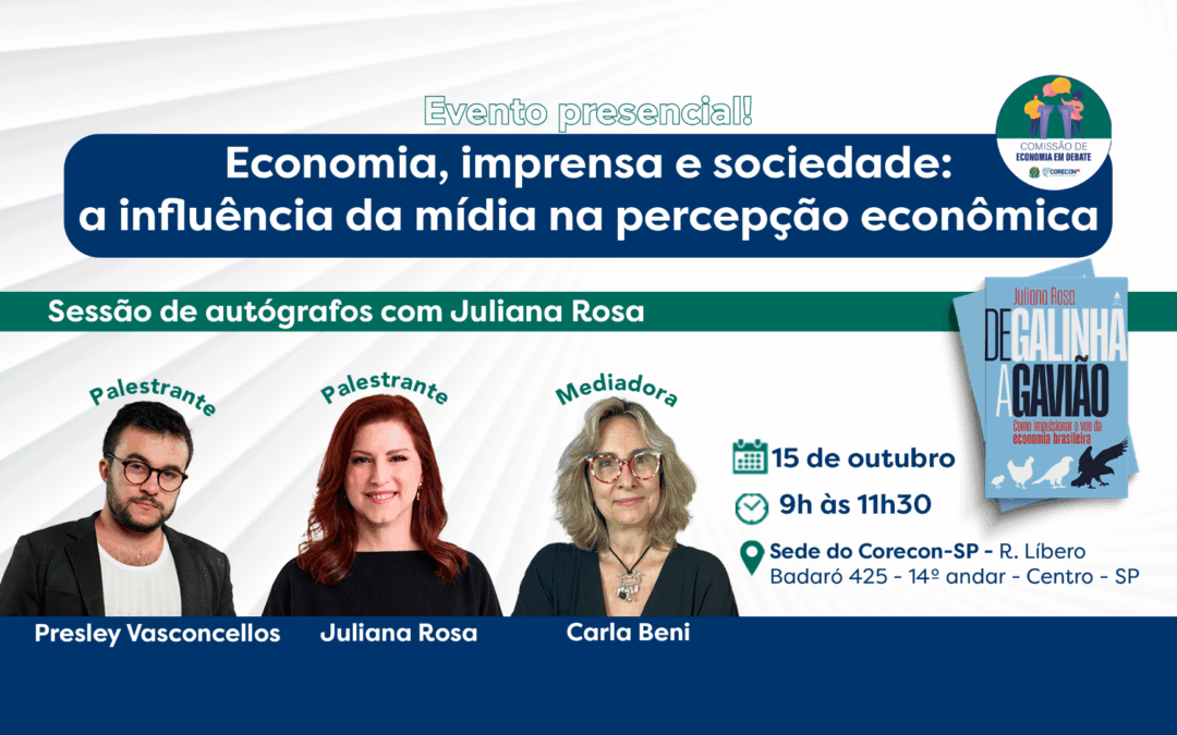 No dia 15 de outubro, das 9h às 11h30, o Corecon-SP, por meio da Comissão de Economia em Debate, promove um encontro imperdível que une economia, mídia e sociedade, com o tema “Economia, imprensa e sociedade: a influência da mídia na percepção econômica”. O debate contará com a participação de especialistas que atuam diretamente na interseção entre economia e comunicação. O evento será presencial e acontecerá na sede do Corecon-SP, localizada na Rua Líbero Badaró, 425 – 14º andar – Centro, São Paulo.