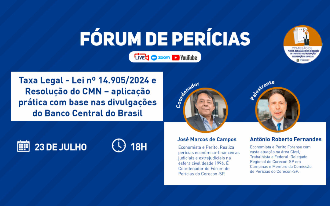 O Fórum de Perícias do Corecon-SP apresenta, nesta quarta-feira, dia 23 de julho, a partir das 18h, o tema “Taxa Legal – Lei nº 14.905/2024 e Resolução do CMN – aplicação prática com base nas divulgações do Banco Central do Brasil”, com enfoque no desenvolvimento de casos práticos e hipotéticos.