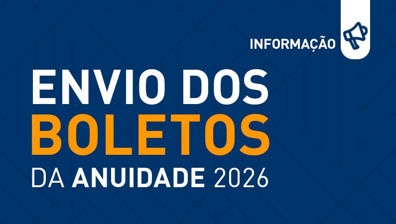 Informamos que os boletos referentes à anuidade 2026 foram enviados, via Correios, para os endereços residenciais cadastrados, ainda em dezembro do ano passado.