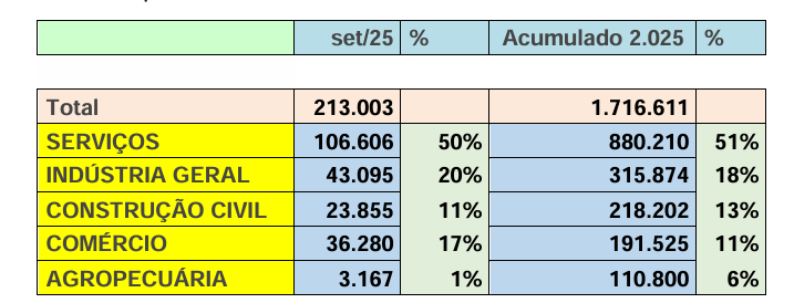 O total de empregos gerados em Setembro 2.025 no CAGED (cadastro geral de empregados e desempregados) publicado, o setor de serviços obteve um saldo positivo de 1 06.606 mil dos empregos formais 50% do total . No acumulado do ano, o setor já gerou 880.210 postos de trabalho, o equivalente a 51% de todos os empregos formais criados nos primeiros nove meses de 2025.