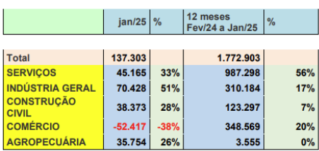 O total de empregos gerados em janeiro 2.025 no CAGED (cadastro geral de empregados e desempregados) publicado, o setor de serviços obteve um saldo positivo de 45.165 mil dos empregos formais 33% do total.