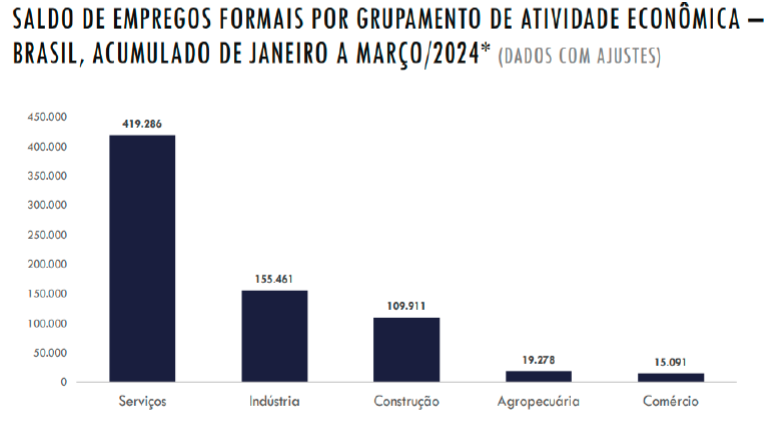 O total de empregos gerados em marços de 2.024 no CAGED (cadastro geral de empregados e desempregados) publicado, o setor de serviços obteve um saldo positivo de 148.722 mil ou seja 61% dos empregos formais.