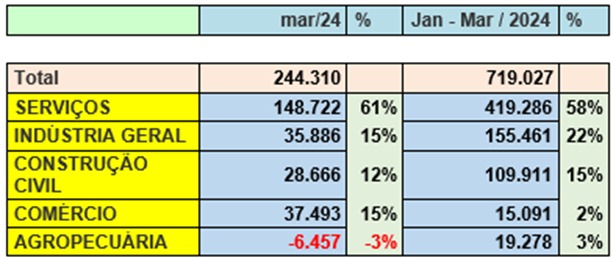 O Brasil passou a ter 244.310 mil trabalhadores com carteira assinada em março de 2.024. No acumulado do ano os dados divulgados pelo Caged, foram 719.033, sendo o setor de serviços responsável por 419.286 (58% de participação), houve saldo positivo na geração de vagas em todos os cinco grupos de atividades.