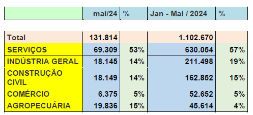 O total de empregos gerados em maio de 2.024 no CAGED (cadastro geral de empregados e desempregados) publicado, o setor de serviços obteve um saldo positivo de 69.309 mil ou seja 53% dos empregos formais.
