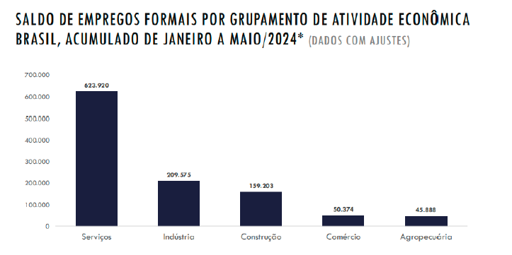 O Setor de Serviços em maio de 2024 foi gerado um saldo de 69.309 postos de trabalho. Os dados registraram saldo positivo no nível de emprego em 6 (seis), dos Grandes Grupamentos de Atividades Econômicas: