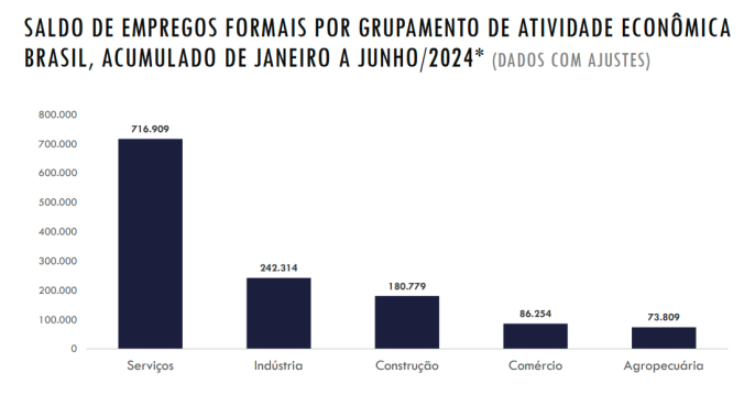 O Setor de Serviços em junho de 2024 foi gerado um saldo de 87.708 postos de trabalho. Os dados registraram saldo positivo no nível de emprego em 6 (seis), dos Grandes Grupamentos de Atividades Econômicas: