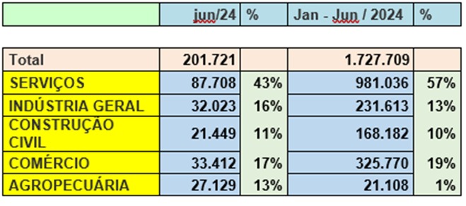 O total de empregos gerados em junho de 2.024 no CAGED (cadastro geral de empregados e desempregados) publicado, o setor de serviços obteve um saldo positivo de 87.708 mil ou seja 43% dos empregos formais.