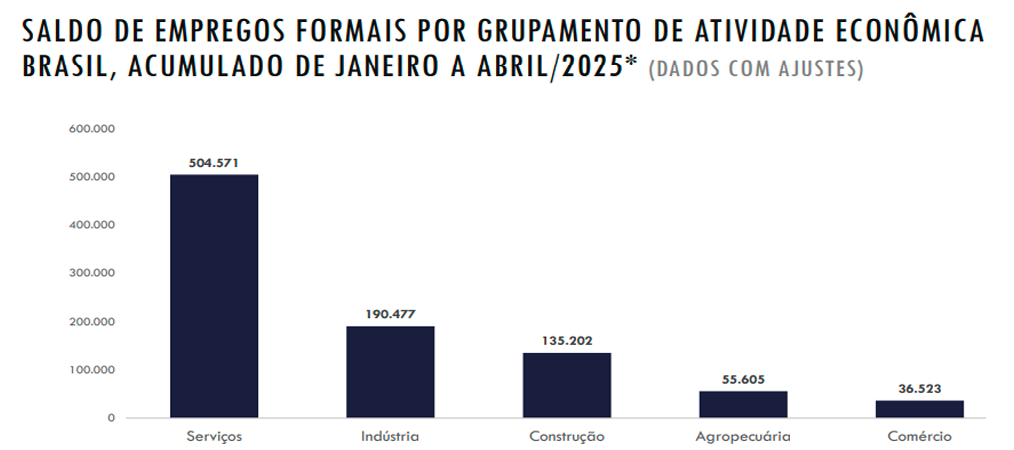 O Setor de Serviços em Abril de 2025 foi gerado um saldo de 136.109 postos de trabalho. Os dados registraram saldo positivo no nível de emprego em 5 (cinco), dos