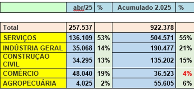 total de empregos gerados em Abril 2.025 no CAGED (cadastro geral de empregados e desempregados) publicado, o setor de serviços obteve um saldo positivo de 136.109 mil dos empregos formais 53% do total. No acumulado do ano, o setor já gerou 504.571 postos de trabalho, o equivalente a 55% de todos os empregos formais criados em 2025.