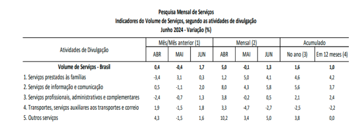 A Pesquisa Mensal de Serviços (IBGE), o volume de serviços prestados no Brasil apresentou uma elevação de 1,7% em junho de 2.024, comparado com o maio de 2.023.