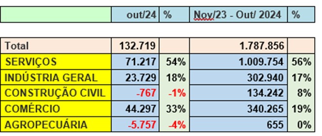 O total de empregos gerados em outubro de 2.024 no CAGED (cadastro geral de empregados e desempregados) publicado, o setor de serviços obteve um saldo positivo de 71.217 mil ou seja 54% dos empregos formais.
