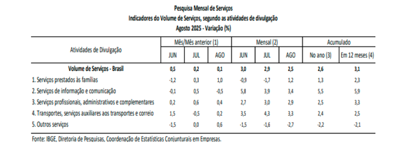 A Pesquisa Mensal de Serviços (PMS), divulgada pelo Instituto Brasileiro de Geografia e Estatística (IBGE), apresenta dados cruciais sobre a evolução do setor de serviços no Brasil. Em agosto de 2025, o volume de serviços registrou uma variação de 0,1 em relação ao mês anterior, refletindo uma estabilidade para a economia nacional.