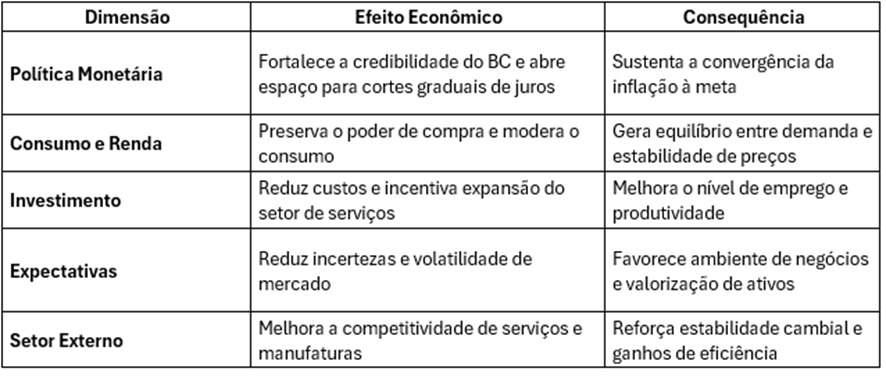 Do ponto de vista técnico, o recuo na inflação de serviços reduz o risco de segunda ordem, isto é, a propagação de reajustes salariais e contratuais atrelados a índices passados. Isso contribui para romper o mecanismo de indexação que, historicamente, tende a manter a inflação elevada mesmo após choques temporários.
