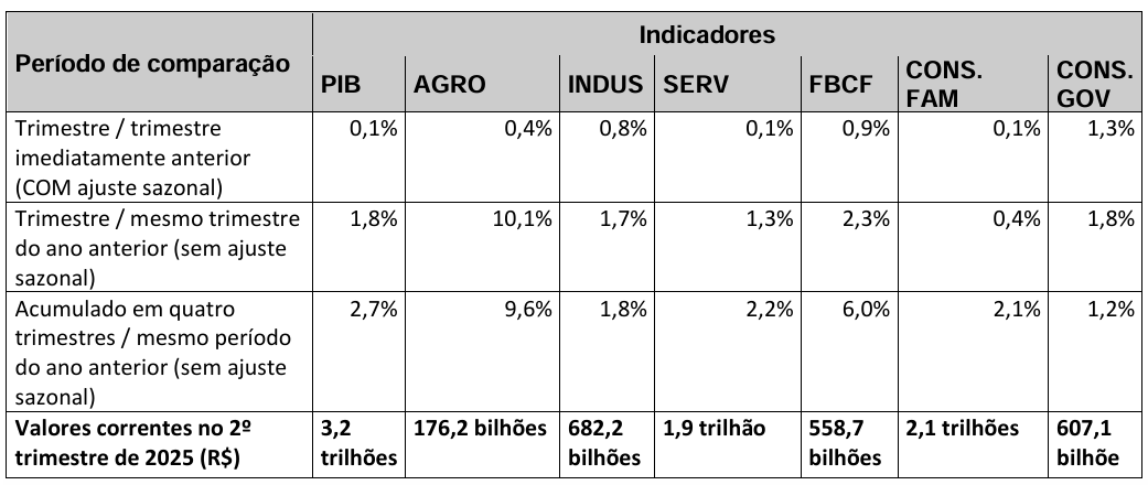 O resultado recente do PIB reflete uma economia em ritmo moderado, com crescimento insuficiente para acelerar emprego e renda. O desempenho tímido do setor de serviços, pilar da economia brasileira, é o principal ponto de atenção, pois compromete a sustentação do crescimento no curto e médio prazo.