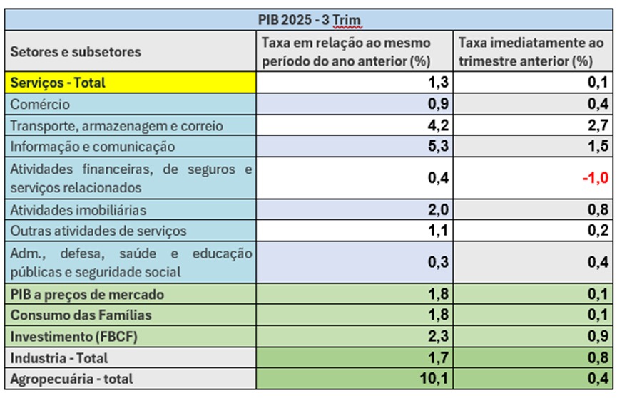O setor de serviços registrou um crescimento, sendo o principal motor da expansão econômica. O resultado do PIB brasileiro no terceiro trimestre de 2025 revelou uma expansão de 0,1% em relação ao trimestre anterior e de 1,3% frente ao mesmo período de 2024. Embora esses números representem evidenciando um cenário de estabilidade econômica após meses de desaceleração. O dado central é que o setor de serviços, se manteve estável e avançou 0,1%, confirmando sua posição como principal vetor de sustentação da atividade econômica nacional.