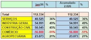 O total de empregos gerados em Janeiro 2.026 no CAGED (cadastro geral de empregados e desempregados) publicado, o setor de serviços obteve um saldo positivo de 40.525 mil dos empregos formais, o equivalente a 36% dos empregos gerados no período.