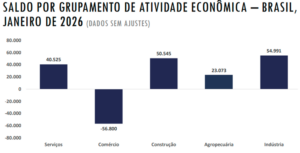 O Setor de Serviços em janeiro de 2026 foi gerado um saldo de 40.525 postos de trabalho. Os dados registraram saldo positivo no nível de emprego em quatro, dos Grandes Grupamentos de Atividades Econômicas: