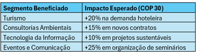 • A COP 30 deve impulsionar fortemente o turismo, hotelaria, alimentação e transporte, com expectativa de aumento significativo na demanda por serviços locais durante o evento.