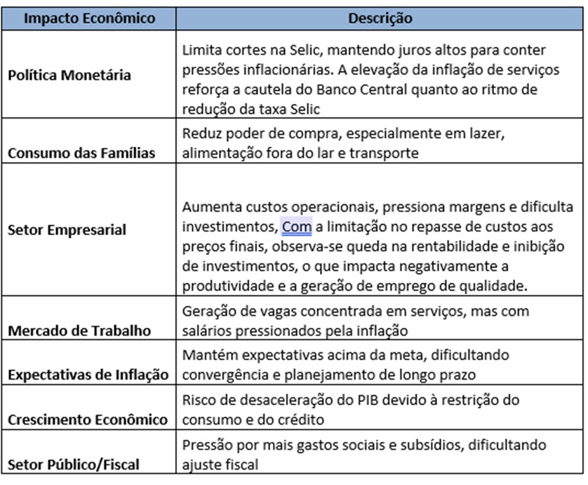 Para o fim de 2025 e início de 2026, as projeções apontam para uma desaceleração gradual da inflação de serviços, condicionada à continuidade da política monetária restritiva e a um possível arrefecimento do mercado de trabalho. Contudo, o cenário de convergência plena à meta dependerá de avanços em políticas estruturais de produtividade, educação e inovação, além da coordenação entre política fiscal e monetária.