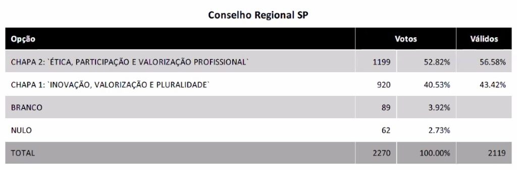 No Corecon-SP, a chapa vencedora foi a Chapa 2 – “Ética, Participação & Valorização Profissional”, que recebeu 1.199 votos.