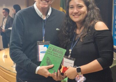 Durante sua fala, compartilhou parte das pesquisas que desenvolve sobre o Brasil e sua relação com a América do Sul, uma região que, embora dividida, apresenta inúmeras oportunidades para o país avançar no desenvolvimento econômico.